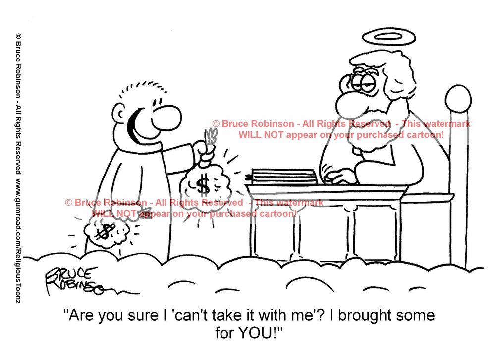 "Are you sure I 'can't take it with me'?..." cartoon